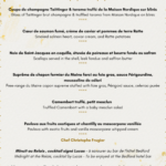 Nous vous invitons à y découvrir la cuisine de Christophe Frugier, disciple de Michel Rostang. Intransigeant sur la qualité, la provenance et la fraîcheur des produits qu’il travaille, Christophe Frugier propose une cuisine française authentique, raffinée et pleine de saveurs.